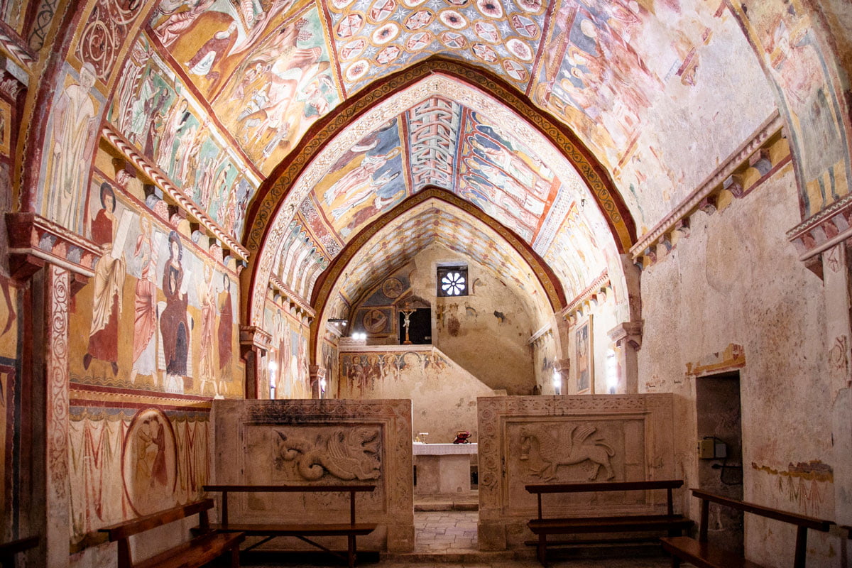 L’interno segue il modello cistercense con una sola navata divisa in tre campate. L’assoluta particolarità della chiesa risiede nei due distinti cicli d’affreschi che ne ricoprono interamente l’interno. Il primo ciclo opera di artisti bizantino-cassinesi nell’abside, nella parete meridionale, nell’arco trionfale e nella parete di contro-facciata, il secondo ad opera di pittori di scuola toscana.